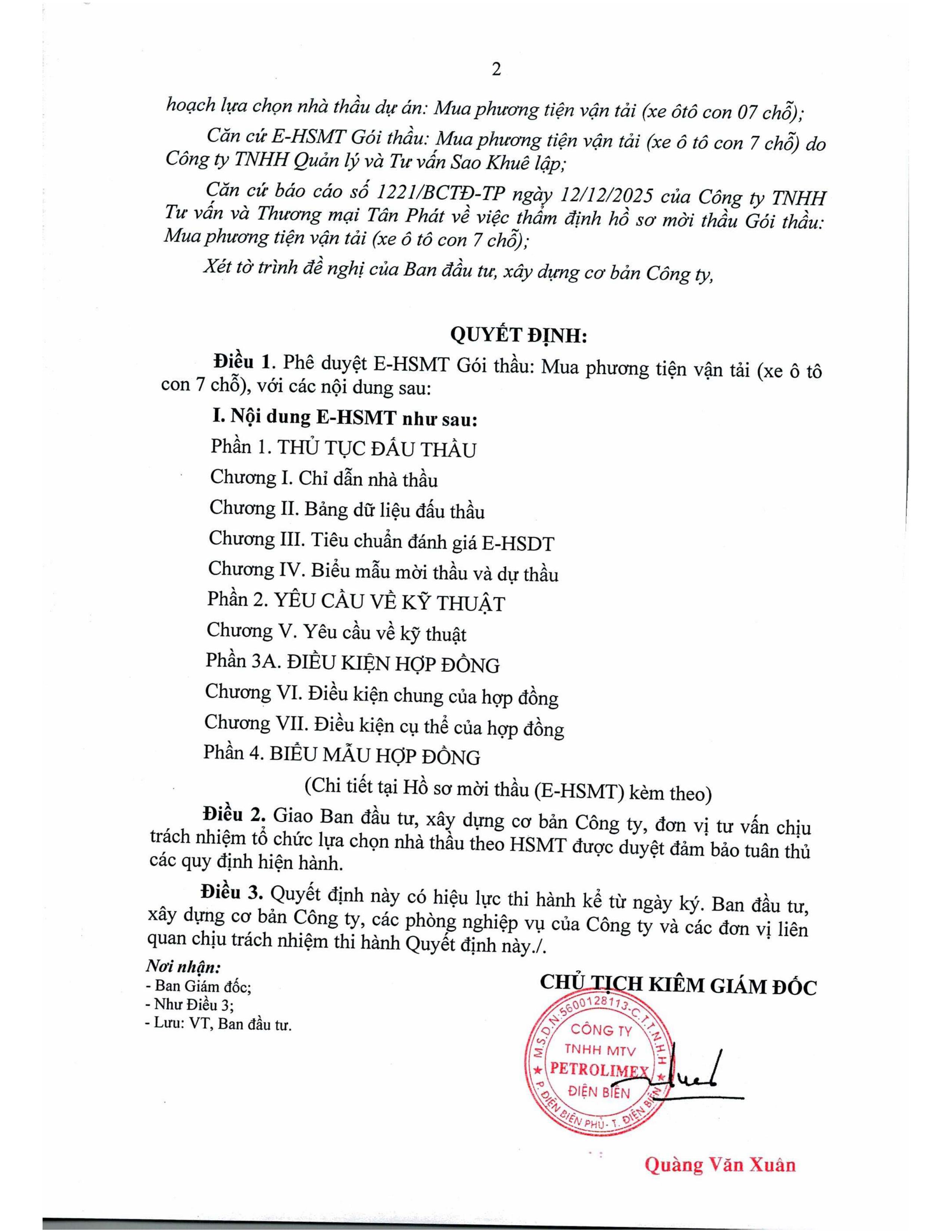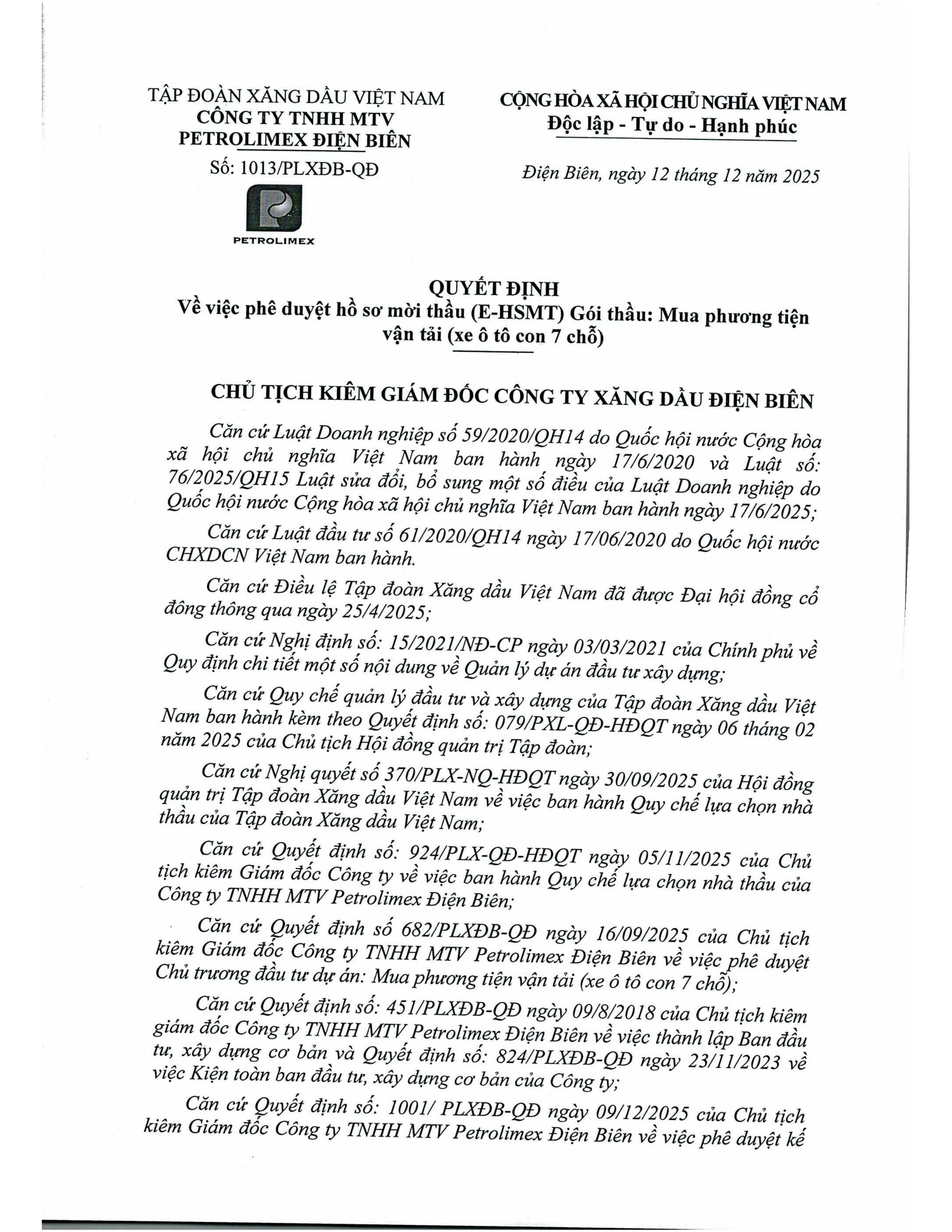 Quyết định số 1013/PLXĐB-QĐ về việc phê duyệt hồ sơ mời thầu gói thầu: Mua phương tiện vận tải (xe oto con 7 chỗ). chi tiết tại file 1, file 2