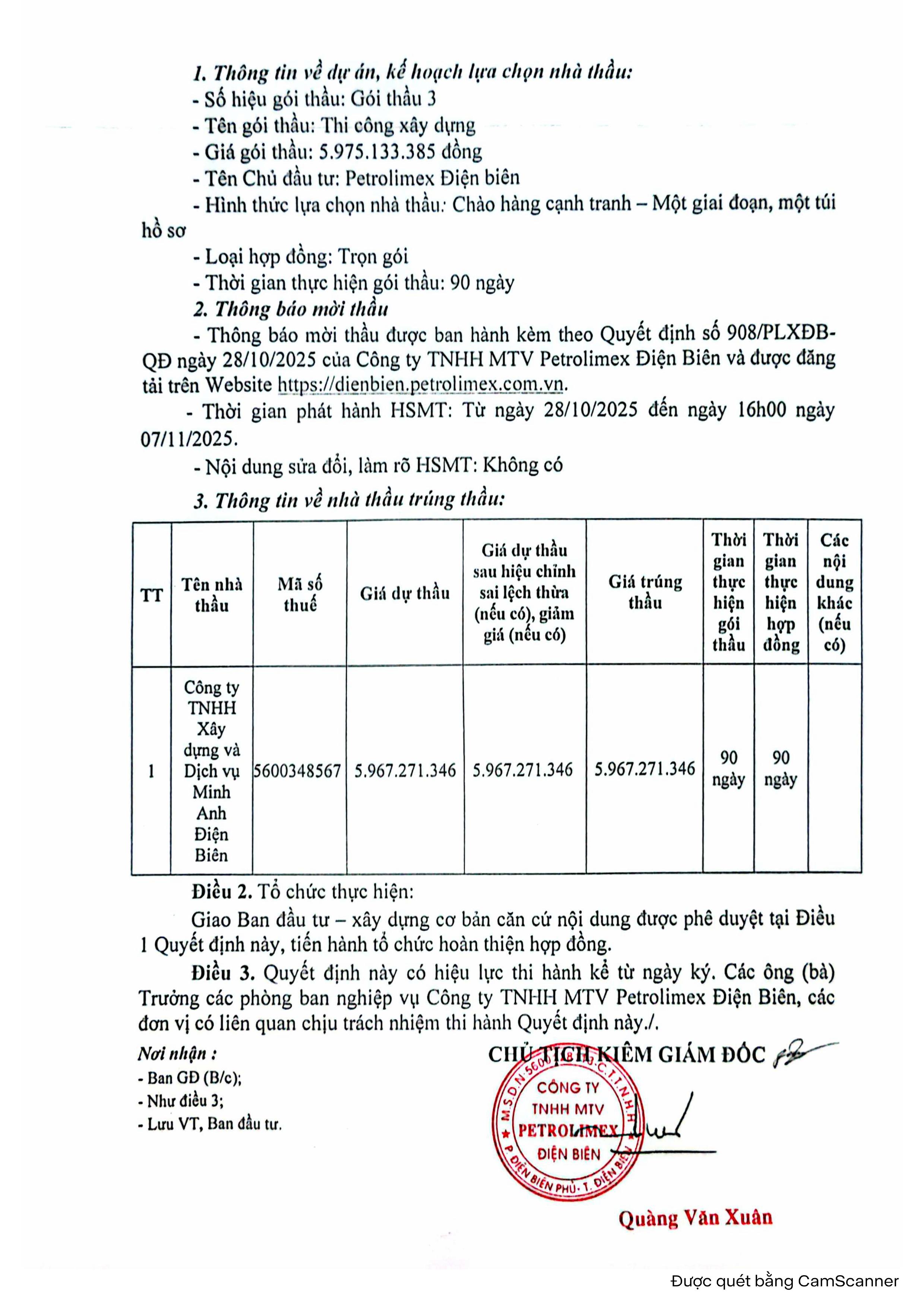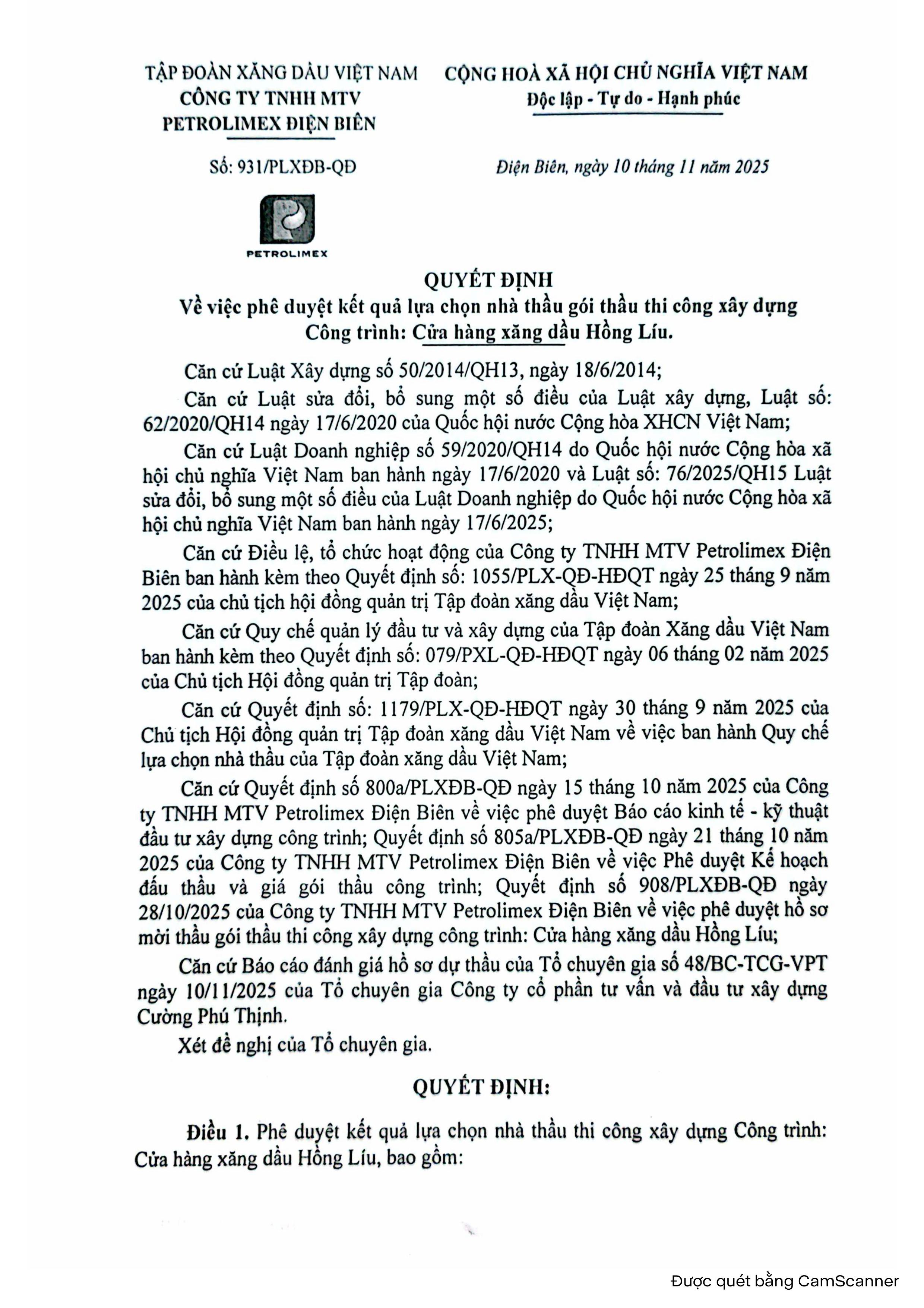 Quyết định số 931/PLXĐB-QĐ ngày 10 tháng 11 năm 2025 về việc phê duyệt kết quả lựa chọn nhà thầu gói thầu thi công xây dựng Công trình: Cửa hàng xăng dầu Hồng Líu, chi tiết xem tại đây